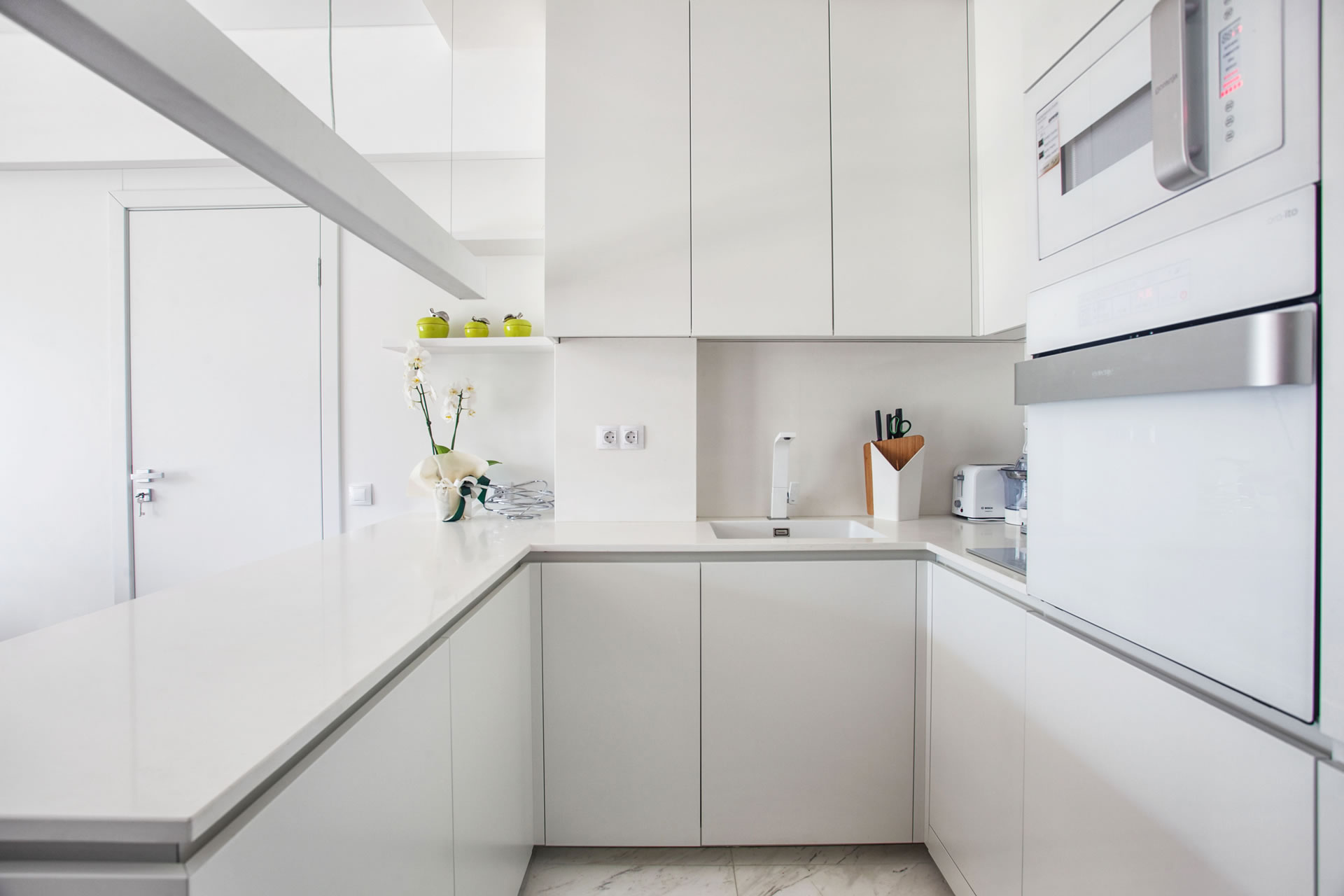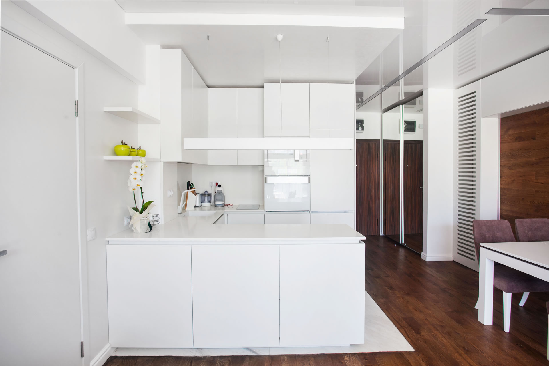 Елегантност и класа – това е определението за този домашен интериор. Желанието на клиентката беше всичко да е бяло, изчистено и успокояващо, нищо да не дразни и натоварва погледа. Белите матови повърхности, омекотихме с топлината на естествената дървесина и текстил. В спалнята наблегнахме на тапицираните елементи за максимален комфорт и дискретно осветление за разкош. А гардеробната е мечтата на всяка жена. Домашна атмосфера изцяло за почивка и наслада.